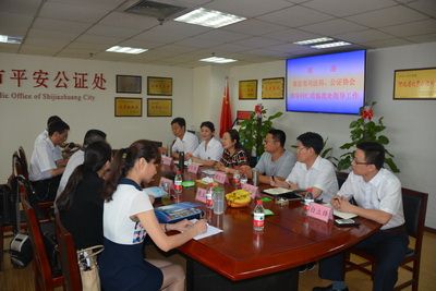 代表团在石家庄市公证协会副会长、平安公证处主任胡晓华的带领下,参观了我处办公环境与各项设施,并对我处所开展的各项公证工作给与了高度评价,参观过后南京市代表团与石家庄市的公证同仁们在我处会议室展开座谈。李铮处长首先代表石家庄市公证人对来访同仁表示了真挚的欢迎,我处胡晓华主任以及燕赵公证处李东明主任、太行公证处田书学主任分别向南京代表团详细介绍了我市公证工作开展情况,随后的交流环节中,来访者对我处业务管理的科学化、信息化建设给予了好评,还就当前社会热点难点问题办理“公证遗嘱”的法律难点、公证机构与房管局之间的矛盾与合作、公证行业中的法律风险以及公证行业未来发展方向等问题与我市公证人进行了深入探讨,座谈在热烈的讨论声中得以完满结束。